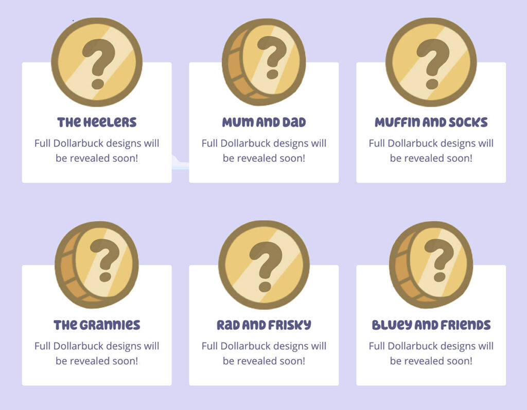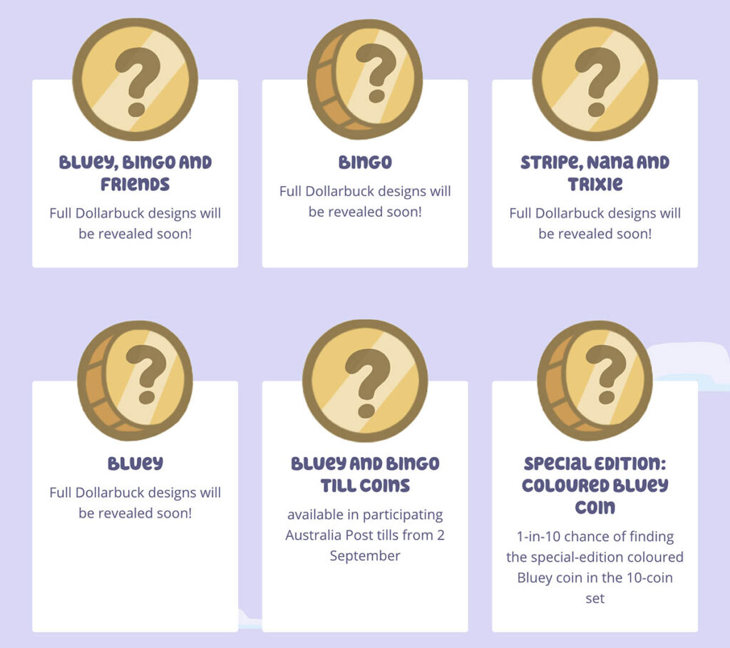 The designs for the coins in the Bluey collectables by Australia Post have yet to be revealed. However, expect to see Bluey, her family and friends featured in the set of 10 $1 coins.